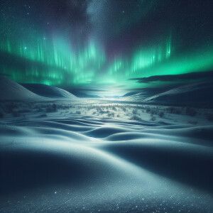 «snowy flield at night with green aurora at dark sky hdri»