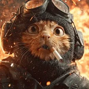 «A wide-eyed ginger cat wearing a black tactical balaclava (or ma...»