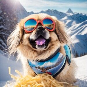 «A happy Pekingese with sunglasses that show a reflection of past...»