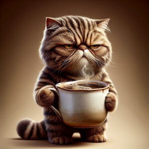 «A grumpy cat holding a coffee cup»