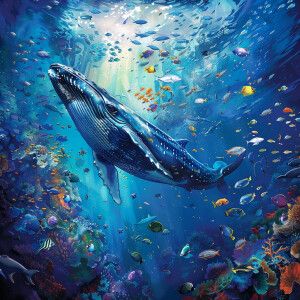 «A whale swimming next to a school of fish»