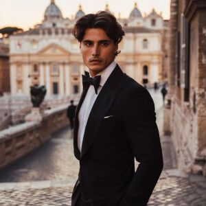 «Capture a striking image of a dark-haired Italian male model wea...»