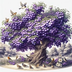«Draw a sketch of plum tree full of plums and birds eating those...»
