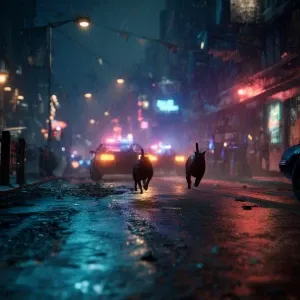 «Humanoid gangster cats sprinting through a neon-lit alley at nig...»