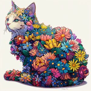 «Imagine a cartoon of a cat with a body covered in a vibrant arra...»