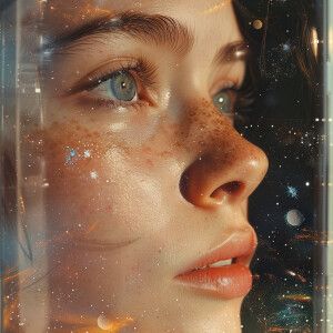 «женское лицо , акцент на левом глазе , в глазе космос»