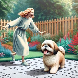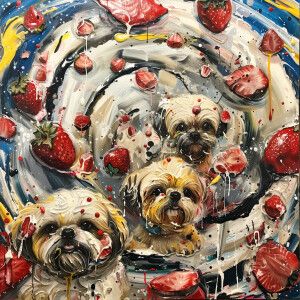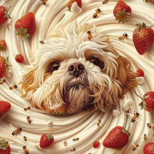 «Shih tzus face surrounded by a swirl of honey bees, strawberry s...»