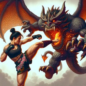 «A fearless Muay Thai fighter delivering a powerful kick to a men...»