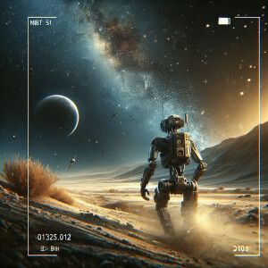 «A robot exploring a deserted planet trail cam footage, photoreal...»