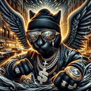 «A menacing black cat, with wings, shades and hip-hop clothing a...»
