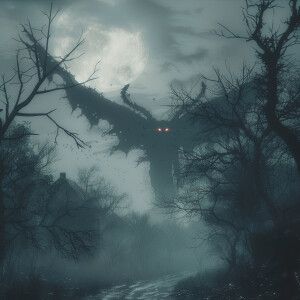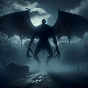«"Amidst a foggy, moonlit forest, Mothman stands ominously on a d...»