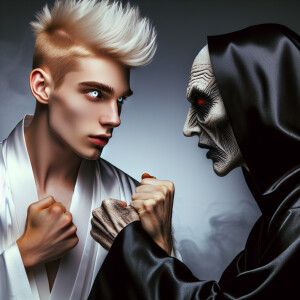 «A blonde faux hawk haired young man, with glowing white eyes, we...»