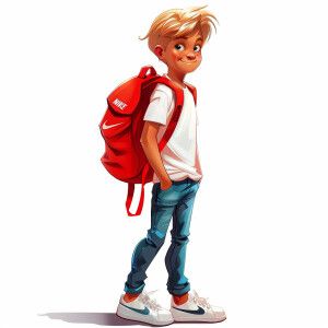 «Blonde boy of 13 years old. Wearing white Nike sneakers, blue je...»