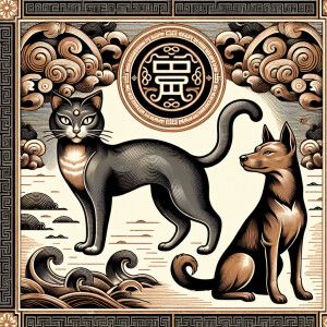 «Describe an emblem featuring a Chinese cat and dog from ancient...»