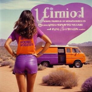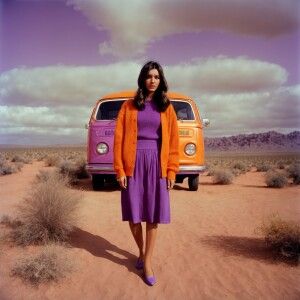 «Film photograph from 1971 if an orange van in the desert with th...»