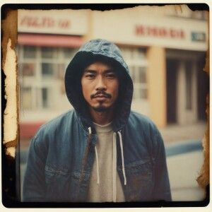 «skinny filipino man, van dyke beard, medium wavy hair, wearing a...»