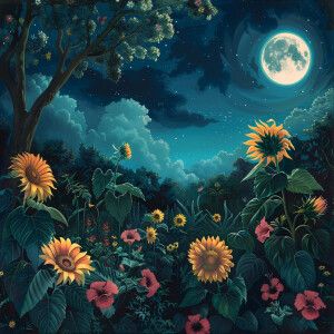 «Create a captivating image of a moonlit scene with sunflowers an...»