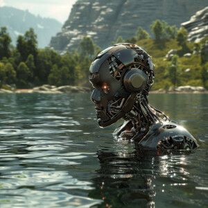«Cyborg's swimming in a lake. HDR, ultra-detailed, masterpiece,...»