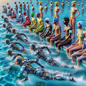 «Cyborg's swimming in a pool, with humans in a lake, HDR, ultr...»