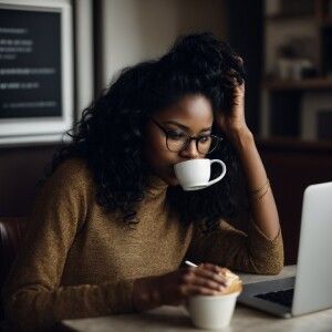 «black women with lone black wavy hair wearing glasses, drinking...»