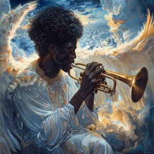 «Black man angel looking at the earth with a trumpet»
