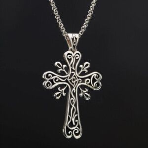 «Sterling silver cross pendant featuring intricate design with in...»