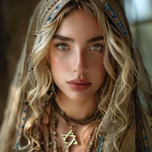 «A stunning woman with blonde hair, donning a Star of David penda...»