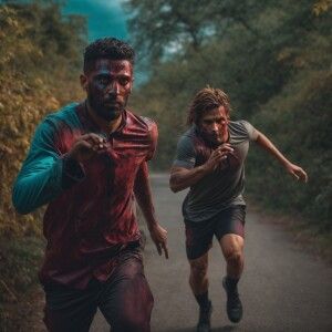 «Zombie chasing a handsome, athletic man.»