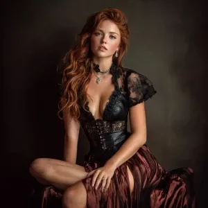 «Black and white silent movie photo of A redhead supermodel dress...»