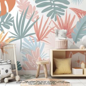 «Обои с тропическими растениями в детскую комнату пастельные мини...»