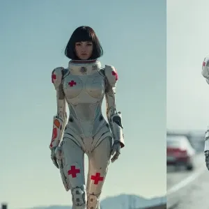 «a japanese magazine advertisement with text of A futuristic fema...»