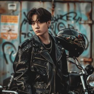 «Bts jungkook standing in front of a motorcycle with a helmet tuc...»