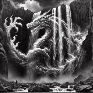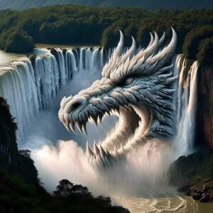 «A large waterfall, water droplets look lile a dragon emerging fr...»