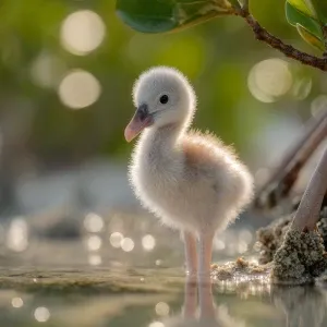 «A newborn baby flamingo chick named Flan, soft pale-gray down wi...»