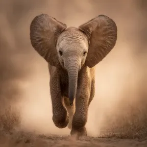 «A baby African elephant named Ember, running joyfully toward the...»