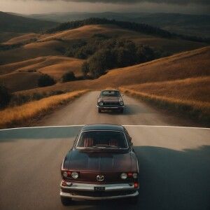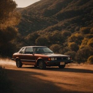 «cinematic shot, birds eye view, bronze 1980 Mazda 626 coupedrivi...»