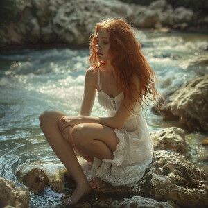 «A high-resolution image of a red-headed girl in a white dress si...»