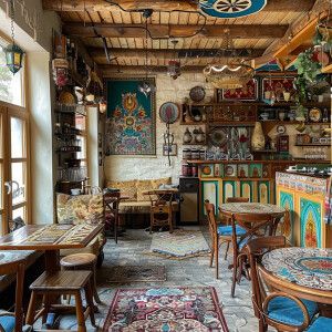 «сгенерируй мне кофейню в дагестанских горах выполненную в стилис...»