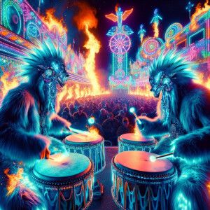 «A psychedelic carnival in Texas, Two Drummers wearing blue wolf...»