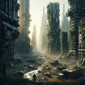 «Futuristic city in ruins, a zombie walking thru,»
