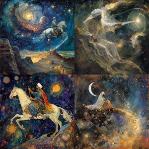 «Muhammad on his night journey Traveling on a white light throug...»