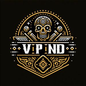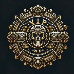«The text is 'VIP IND', BACKGROUND BLACK, BADGE GOLD, Skull and e...»