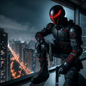 «Red hood (from teen titans)crouching on a ledge of a high-rise a...»