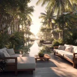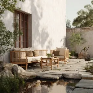 «Create a serene outdoor lounge with minimalist bamboo furniture,...»