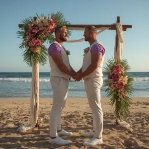 «Two muscular men standing together on a sunlit tropical beach, p...»