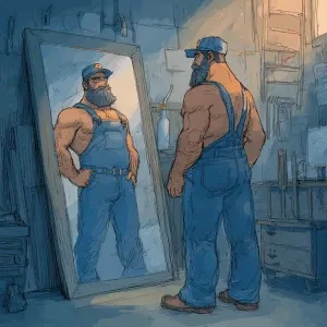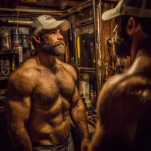 «Create an image of a muscular and hairy handyman admiring himsel...»