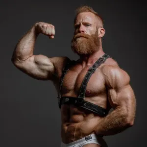 «The image depicts a very hairy muscular, ginger bearded man posi...»