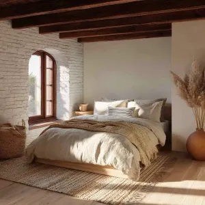 «High-resolution photograph of a natural textures bedroom, full-r...»