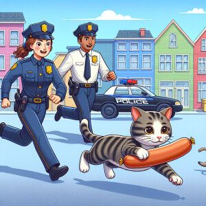 «Создай изображение кота, который украл сосиску и убегает от поли...»