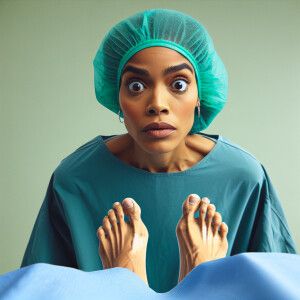 «Photo from patient pov, of Worried Dominican woman surgeons we...»